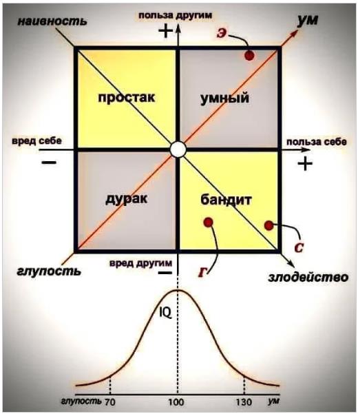 Третий закон предполагает, что все люди делятся на 4 группы: простаки (П), умники (У), бандиты (Б) и глупцы (Г). Если Петя предпринимает действие, от которого несет потери и при этом приносит выгоду Васе, то он относится к простакам (зона П). Если Петя делает нечто, что приносит выгоду и ему, и Васе, он умник, потому что действовал умно (зона У). Если действия Пети несут ему выгоду, а Вася от них страдает, то Петя — бандит (зона Б). И наконец, Петя-глупец находится в зоне Г, в минусовой зоне по обеим осям.
